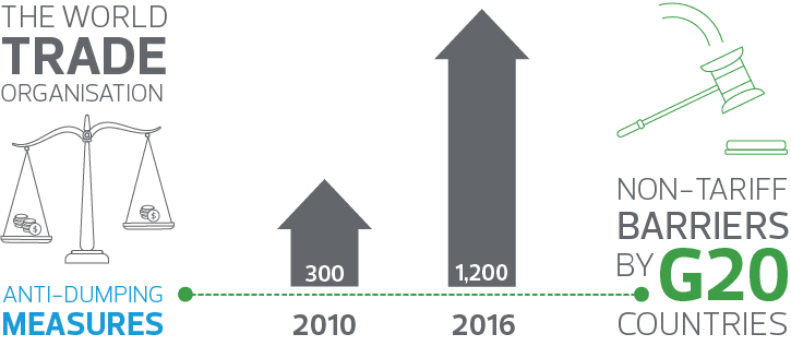 Although there has so far been no general 1930s-style increase in import tariffs, there is a rise in other forms of protectionism. The World Trade Organisation calculates that non-tariff barriers operated by G20 countries, such as anti-dumping measures, grew from about 300 in 2010 to more than 1,200 by 2016.